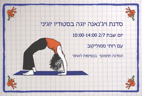 יום שבת (2/7), 14:00-10:00 בסטודיו יוגיני, רוטשילד 4 תל-אביב. נפתח את הסדנה במדיטציה ובתרגילי נשימה (פראניאמה). לאחר מכן נמשיך לתנוחות יוגה בזרימה, מתוך הקשבה לקצב האישי. התרגול יתמקד בתנוחות כפיפה לאחור, או ליתר דיוק: התארכות הגוף הקדמי. אורכה של הסדנה יאפשר לנו לתרגל באופן מעמיק יותר. נחפש את התארכות הגוף הקדמי בניסיון לשמור על קשר עם האדמה, חיבור לאמצע וגב שקט. הסדנה מתאימה למתרגלים מתחילים ומנוסים כאחד. אשמח לראותכם עלות: 100 שקלים - הרשמה מראש אצל יעל: 054-7837529